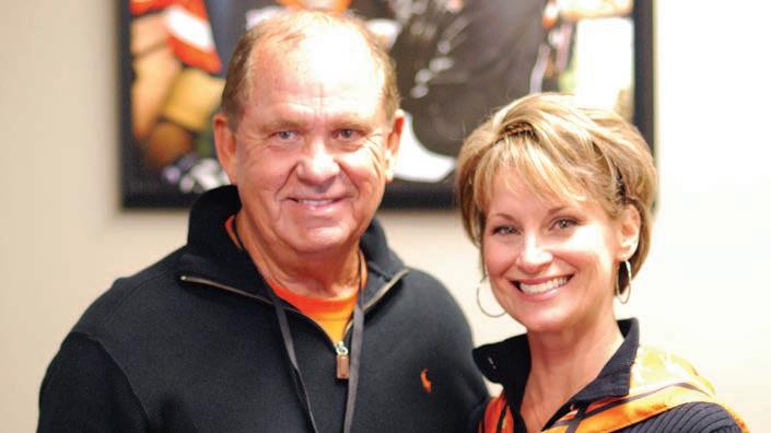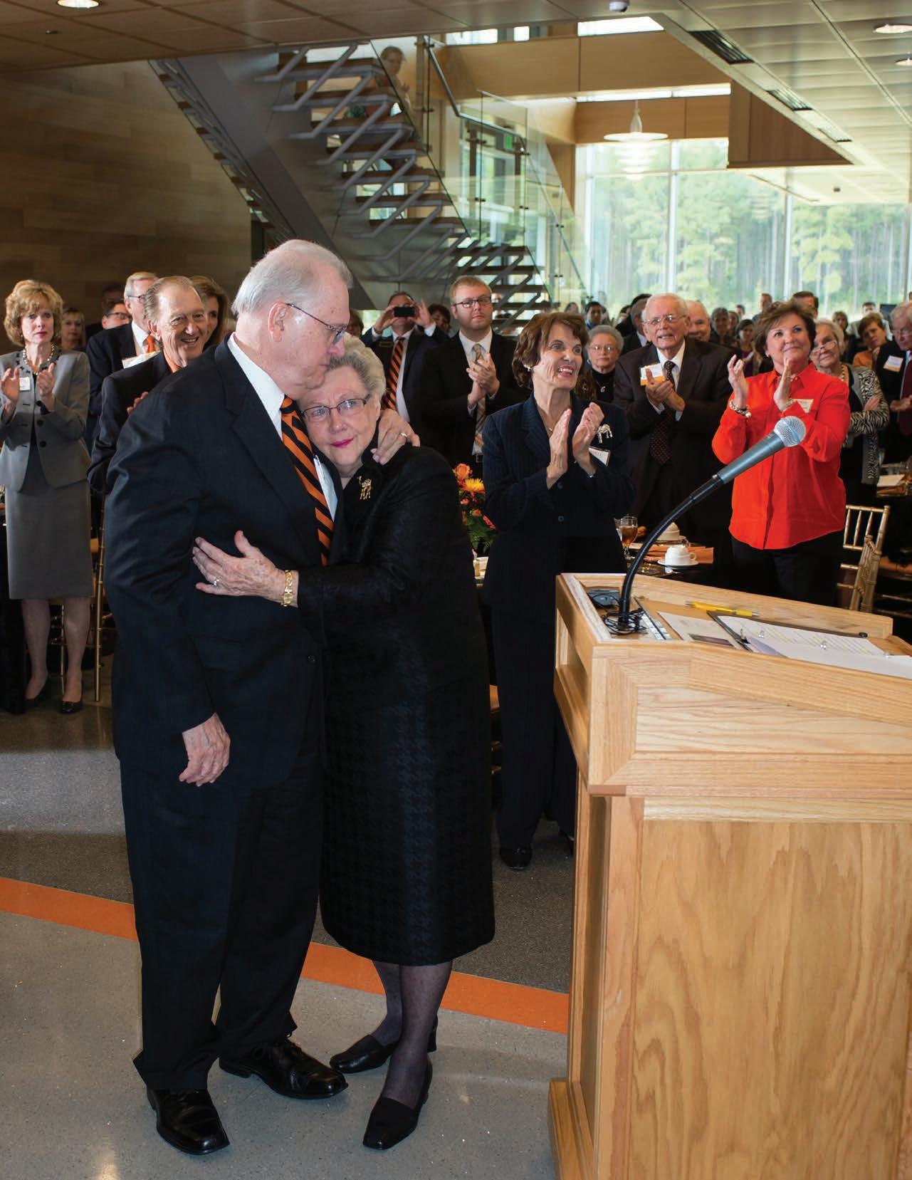 Pat Barker shares a laugh with her husband, Bob Barker, during the dedication ceremony for Pat Barker Hall, a freshman women’s dormitory built in 2010. | Photo by Billy Liggett