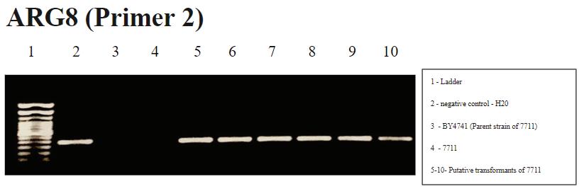 there is an available selectable marker (Arg8m) and the ability to survive with mitochondrial gene mutations [4]. These characteristics allow us to edit the mitochondrial freely to see if the technique is successful. Our project incorporates two strains of S. cerevisiae, BY4741 and 7711. BY4741 is the parent strain of 7711, which contains the nuclear Arg8 gene. 7711 has had its nuclear Arg8 gene knocked out and replaced with a kanamycin resistance gene and can be selected for in the presence of geneticin, or G418 antibiotic. Notably, 7711 cannot grow on minimal media that does not contain arginine. In our experiments, we attempt to insert a mitochondrial version of Arg8 (Arg8m) into 7711 which, if successful, would allow growth on minimal media lacking arginine. The mitochondrial version of Arg8 is optimized for the genetic code of the yeast mitochondria and contains several sequences that would be stop codons in the nuclear genetic code, thereby eliminating the possibility of an accidental nuclear transformation.