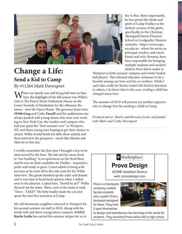 the A-Hut. More importantly, he has spread the ideals and spirit of Camp Dudley to the farthest corners of the globe; specifically, to the Christian Aboriginal Parent Directed School in Coolgardie, Western Australia - https://www.caps. wa.edu.au - where he serves as principal, teacher, and coach. Kurtis and wife, Rowena, have been responsible for bringing multiple students and student/ athletes from down under to Westport as both summer campers and winter basketball players. This talented educator continues to be a favorite among our boys and his co-workers. While I can’t take credit for Kurtis Leslie’s life lived in devotion to others, I do know that in this case, sending a child has changed many lives.