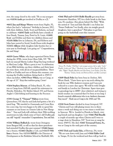 #7689 Hank Poler has been busy in Grafton, MA. Wrote Hank, “I have been up to my neck editing the book for our 50th Amherst reunion and I am now reduced to a mere class agent. We will be with Dwight and family in London for Christmas. Spare time goes to genealogy (up to 4000+ close relatives), and trying to finish touches on a musical that I’ve been at too long. I found a musical collaborator who is an Amherst classmate. Stay tuned.” Hank was at Camp in the 1940s and ’50s. #7820 Scott Foster checked in from Liverpool, NY. “Christa and I are still playing tennis two to three times a week and skiing one to two times a week here in Syracuse. We’re headed to Florida in March, visit- ing friends and my daughter. I saw #7441 Phil Bisselle a couple of months ago when Christa and I went to a stage show in Hamilton, NY.” Scott was at camp be- tween 1949-52. His dad, #2667 Townsend Foster, Sr., was at Camp in the early part of the century. #7987 Dick and Linda Edie, of Berwyn, PA, wrote “We are now down with Joan and #5616 Eddie Card in Tampa, FL for the weekend and then will go back to SPRING 2013