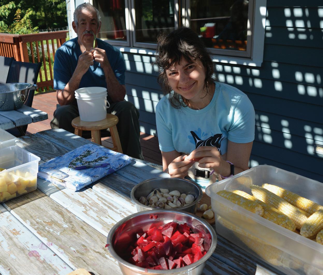 Processing ingredients is a fun, social activity for the residents of Undina, one of three care houses in the Village. Mike Davis is preparing beans on the porch on a beautiful late-summer afternoon.