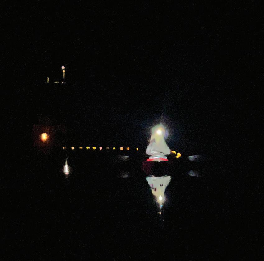 A ghostly figure drags a snake of LED lights across the Hall Pond.
