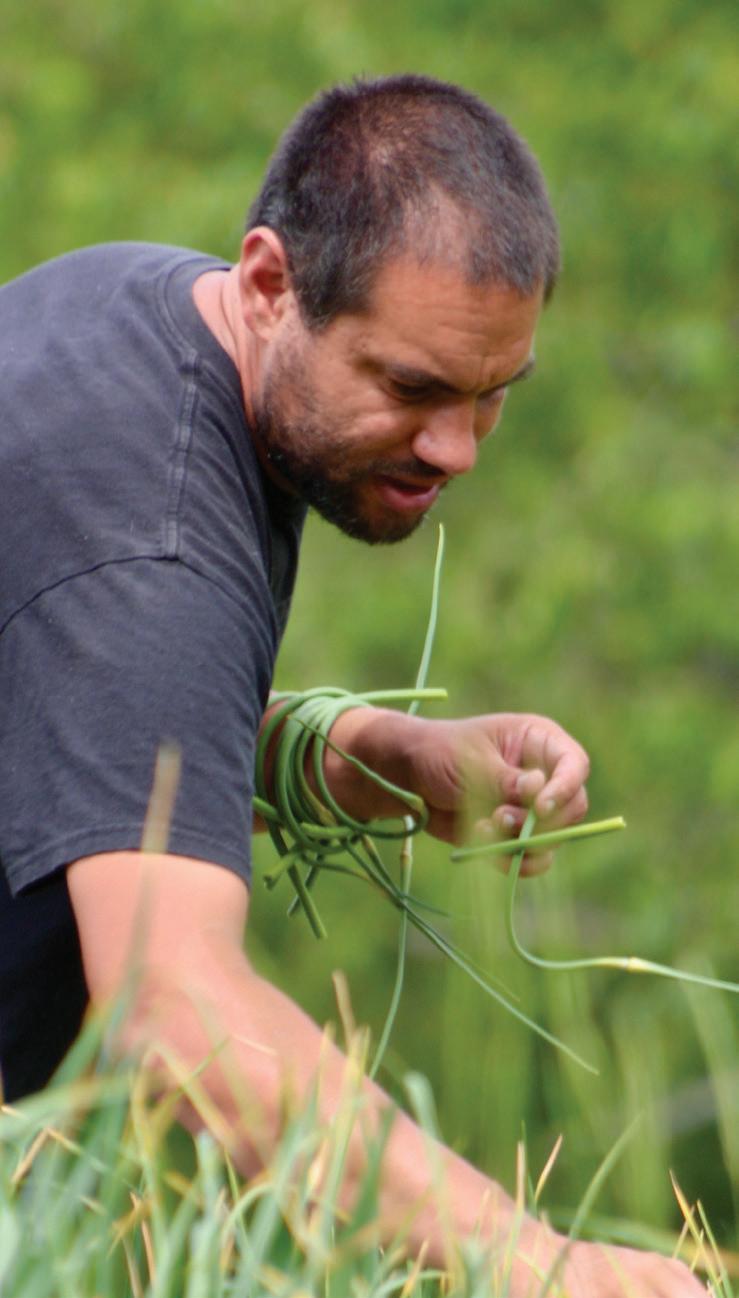 uses a creative method to harvest scapes in the upper vegetable garden.