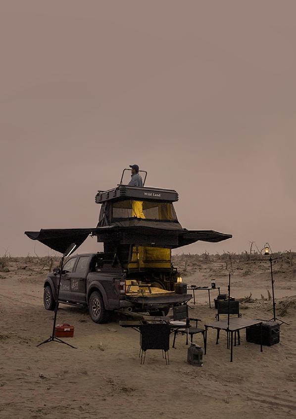 Das Dachzelt kommt mit: Sonnensegel, Duschzelt, Truckbett-Stabilisator, Tarp, Schlafsack, Luftkissen, Tisch, Tragbarer Stuhl/Lounge, Fleecematte, 2 Fernbedienungen, 4 Bluetooth-Lautsprecher, 4 abnehmbare LED-Lichter, klappbarer Bambustisch, gelöchertes Bodenpanel