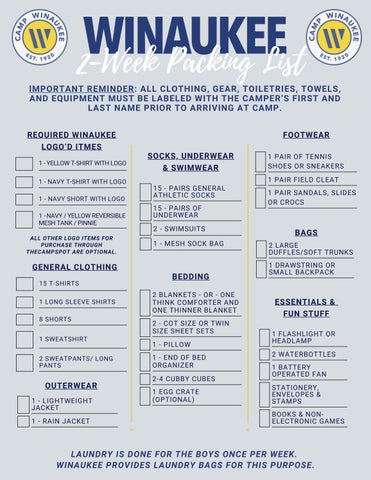 IMPORTANT REMINDER: ALL CLOTHING, GEAR, TOILETRIES, TOWELS, AND EQUIPMENT MUST BE LABELED WITH THE CAMPER’S FIRST AND LAST NAME PRIOR TO ARRIVING AT CAMP. SUGGESTED