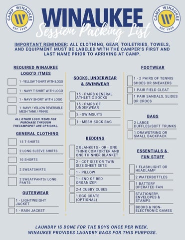 IMPORTANT REMINDER: ALL CLOTHING, GEAR, TOILETRIES, TOWELS, AND EQUIPMENT MUST BE LABELED WITH THE CAMPER’S FIRST AND LAST NAME PRIOR TO ARRIVING AT CAMP.
