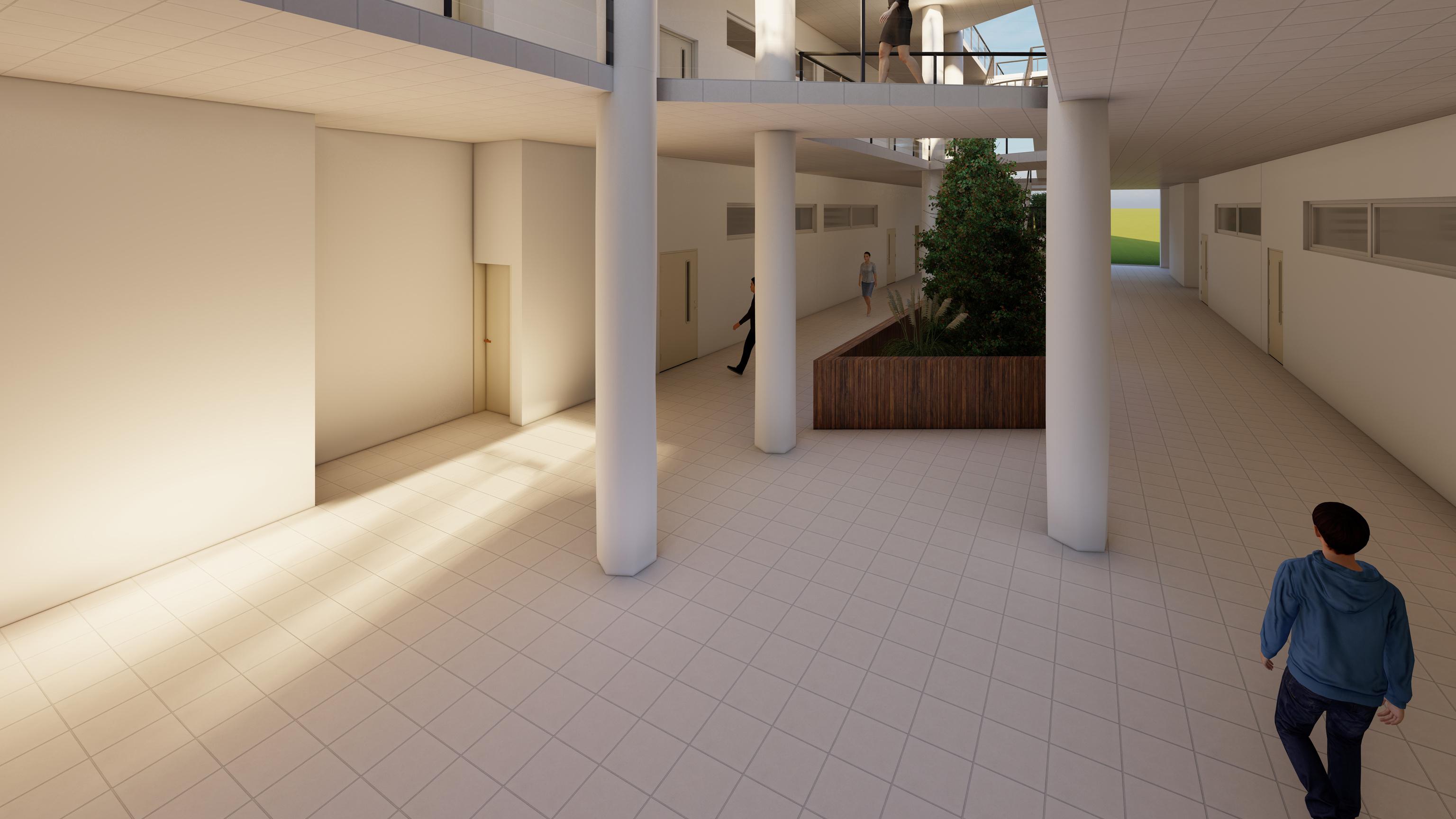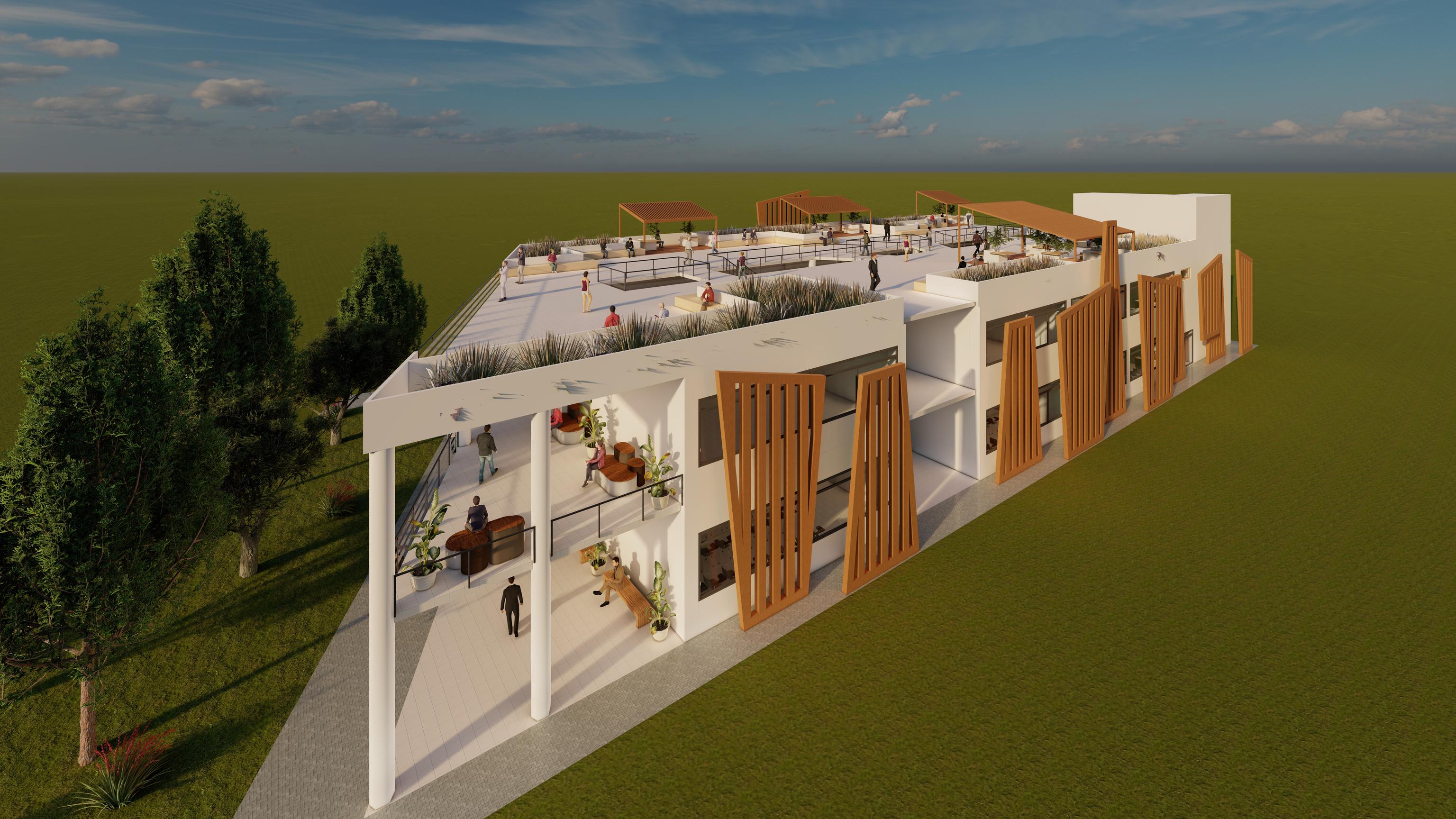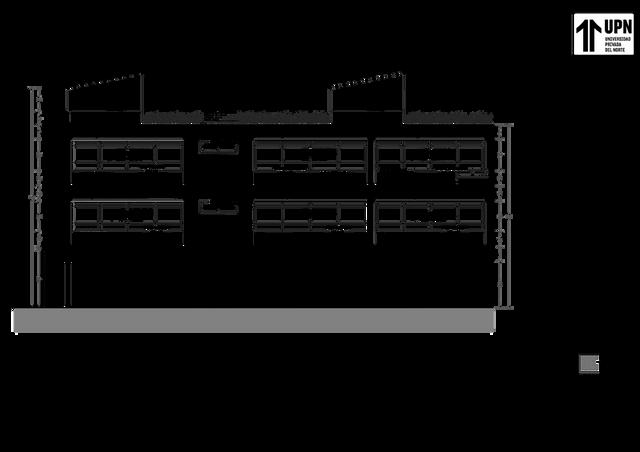 Se utiliza la forma de la huaca de Jesus Maria para la fachada del sector académico, dando como resultado una forma trapezoidal inclinada lo que genera un ritmo en la elevación Celosias