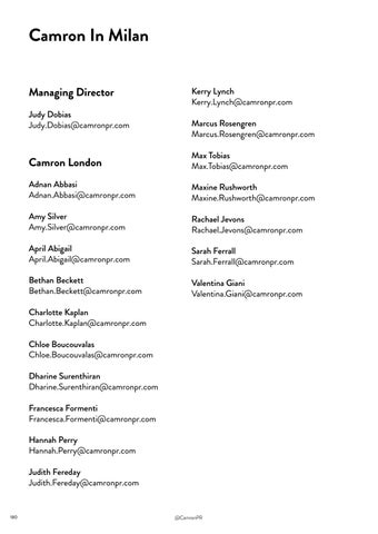 Charlotte Kaplan Charlotte.Kaplan@camronpr.com Chloe Boucouvalas Chloe.Boucouvalas@camronpr.com Dharine Surenthiran Dharine.Surenthiran@camronpr.com Francesca Formenti Francesca.Formenti@camronpr.com Hannah Perry Hannah.Perry@camronpr.com Judith Fereday Judith.Fereday@camronpr.com