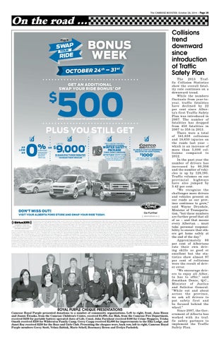 T he 2 013 T ra ff ic Collision Statistics show the overall fatality rate continues on a downward trend. While the numbers f luctuate from year-toyear, traff ic fatalities have declined by 22 per cent since Alberta’s f irst Traff ic Safety Plan was introduced in 2007. The number of fatalities has dropped from 458 fatalities in 2007 to 358 in 2013. There were a total of 141,638 collisions and 18,650 injuries on the roads last year – which is an increase of more than 5,000 collisions compa red to 2012. In the past year the number of drivers has increased by 80,306 and the number of vehicles is up by 128,195. Traff ic volumes on our prov i nc ia l h ighways have also jumped by 3.42 per cent. “ We recog nize the challenges more drivers and vehicles present on our roads as our province continues to grow,” said Wayne Drysdale, Minister of Transportation, “but these numbers are further proof that all of us – and that means every Albertan – must take personal responsibility to ensure that others get home safely at the end of the day.” Approx imately 86 per cent of Albertans rate their own driving skills as good or excellent but the statistics show almost 87 per cent of collisions were the result of driver error. “We encourage drivers to enjoy all Alberta has to offer,” said Jonathan Denis, Q.C., M in ister of Justice and Solicitor General. “While out and about across the province, we ask all drivers to put safety f irst and be focused behind the wheel.” Since 2007, the Government of Alberta has worked with its traff ic safety partners to implement the Traff ic Safety Plan.