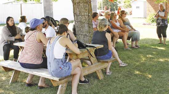 Murray Green, Camrose Booster Battle River Watershed Alliance staff members Kiera Abanz, left, and Belle Dodds, right, discuss how animals affect the watersheds in the area with Genevie Vallet and Kayla Matthew at the Camrose and District Centennial Museum on July 12.