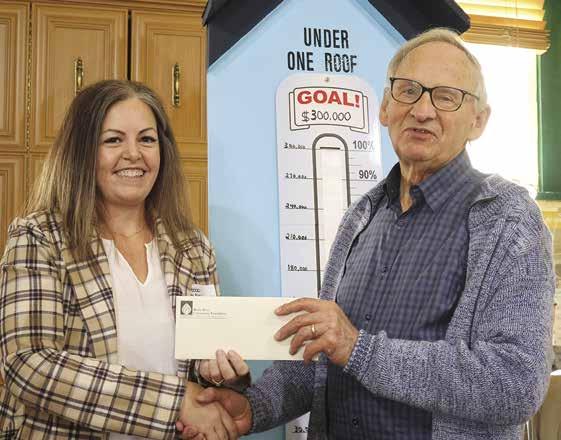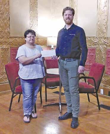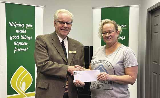 The Battle River Community Foundation awarded a $1,200 grant to the Camrose and Area Animal Shelter Society. Alex Oliver, a director with the Battle River Community Foundation board, presents the cheque to Sherry Lafortune, president of the Society.