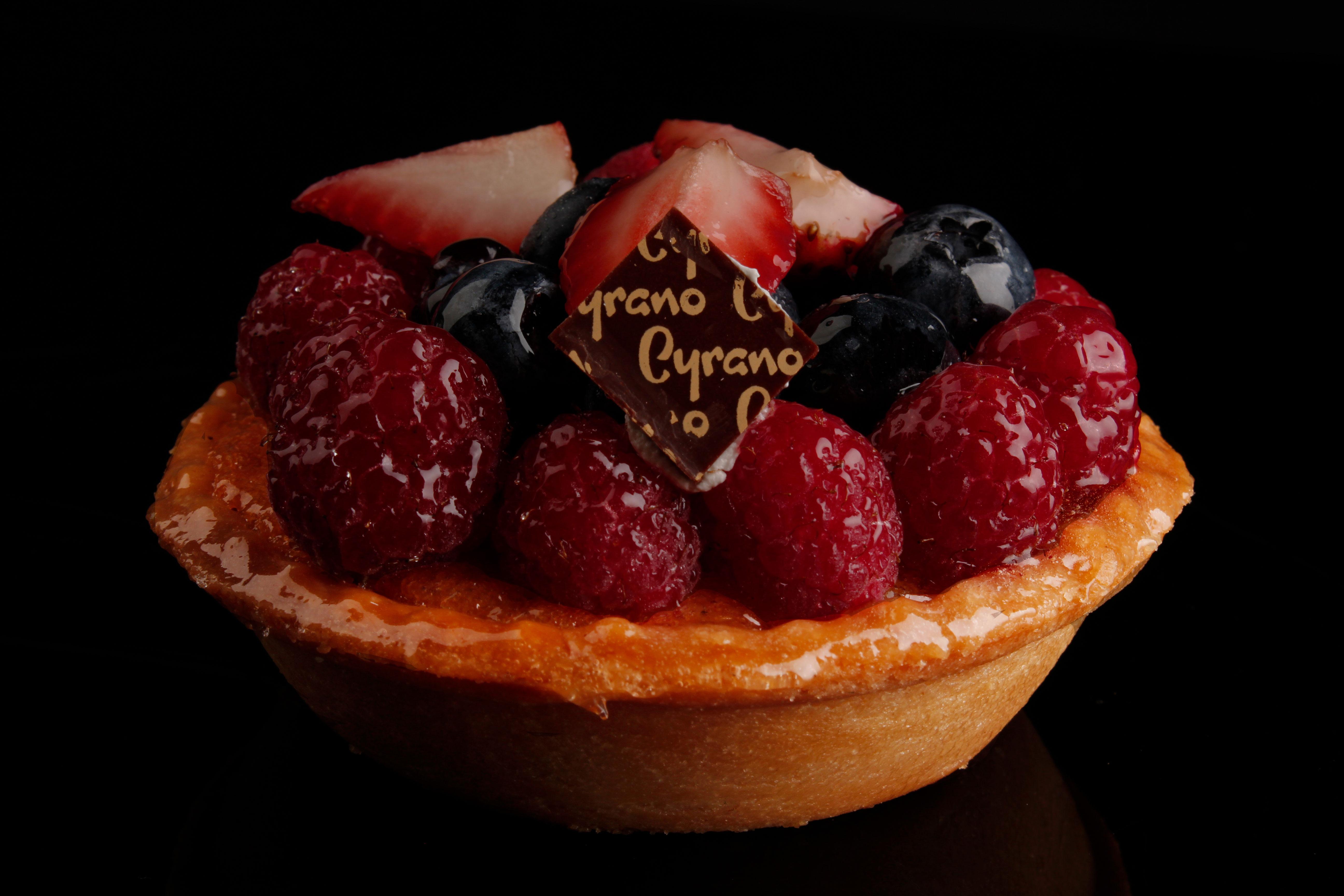 Se muestra una tartaleta de frutos rojos frescos, llena de frambuesas, fresas y moras que destacan por sus colores vibrantes. Sobre un fondo neutro, la imagen resalta la textura crujiente de la base y la frescura de la fruta, logrando un equilibrio entre lo dulce y lo natural.