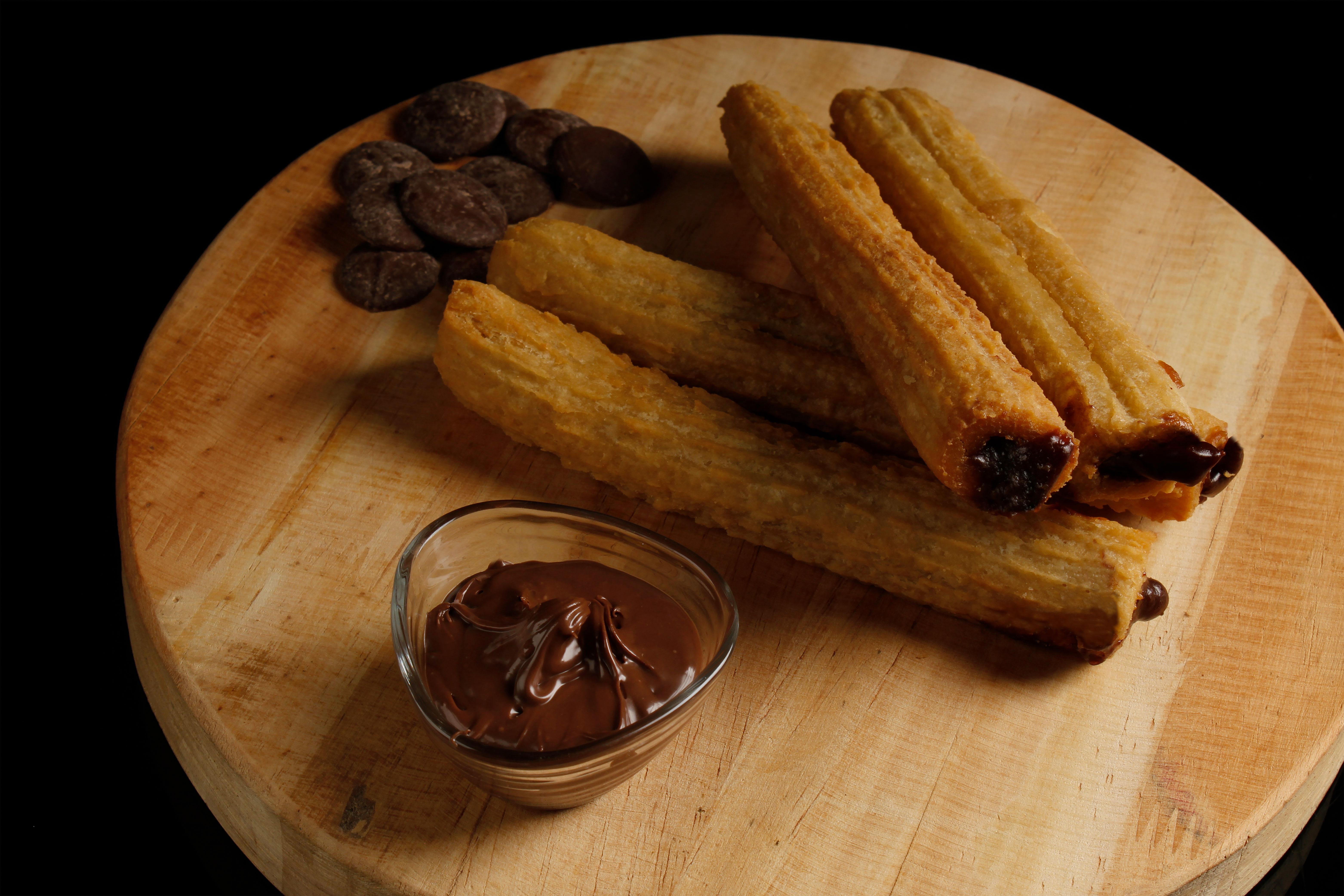 En la revista, una foto destaca un churro cubierto de chocolate, posado sobre un fondo negro que realza su textura crujiente y el brillo del chocolate. La imagen captura la calidez y lo irresistible del postre, invitando a saborearlo con la vista.