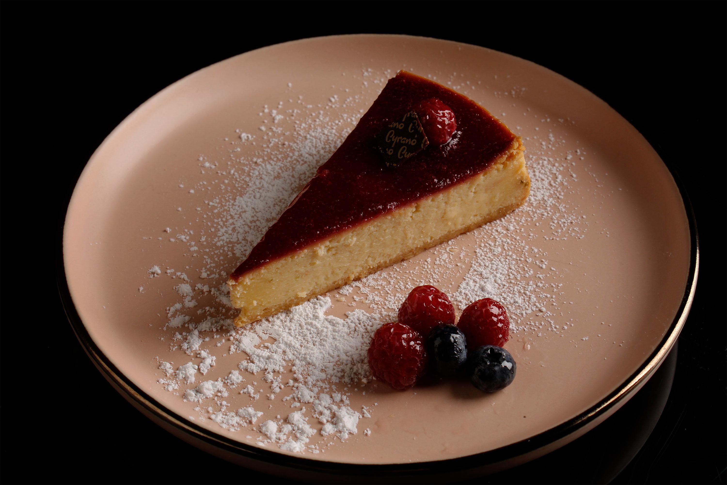 La revista presenta una fotografía de un cheesecake decorado con una mezcla de frutos rojos, añadiendo un toque vibrante de color sobre la suavidad cremosa del pastel. La base de galleta dorada contrasta perfectamente con los tonos rojos y morados de los frutos. La imagen tiene un fondo oscuro y minimalista, lo que permite que el cheesecake sea el punto focal.
