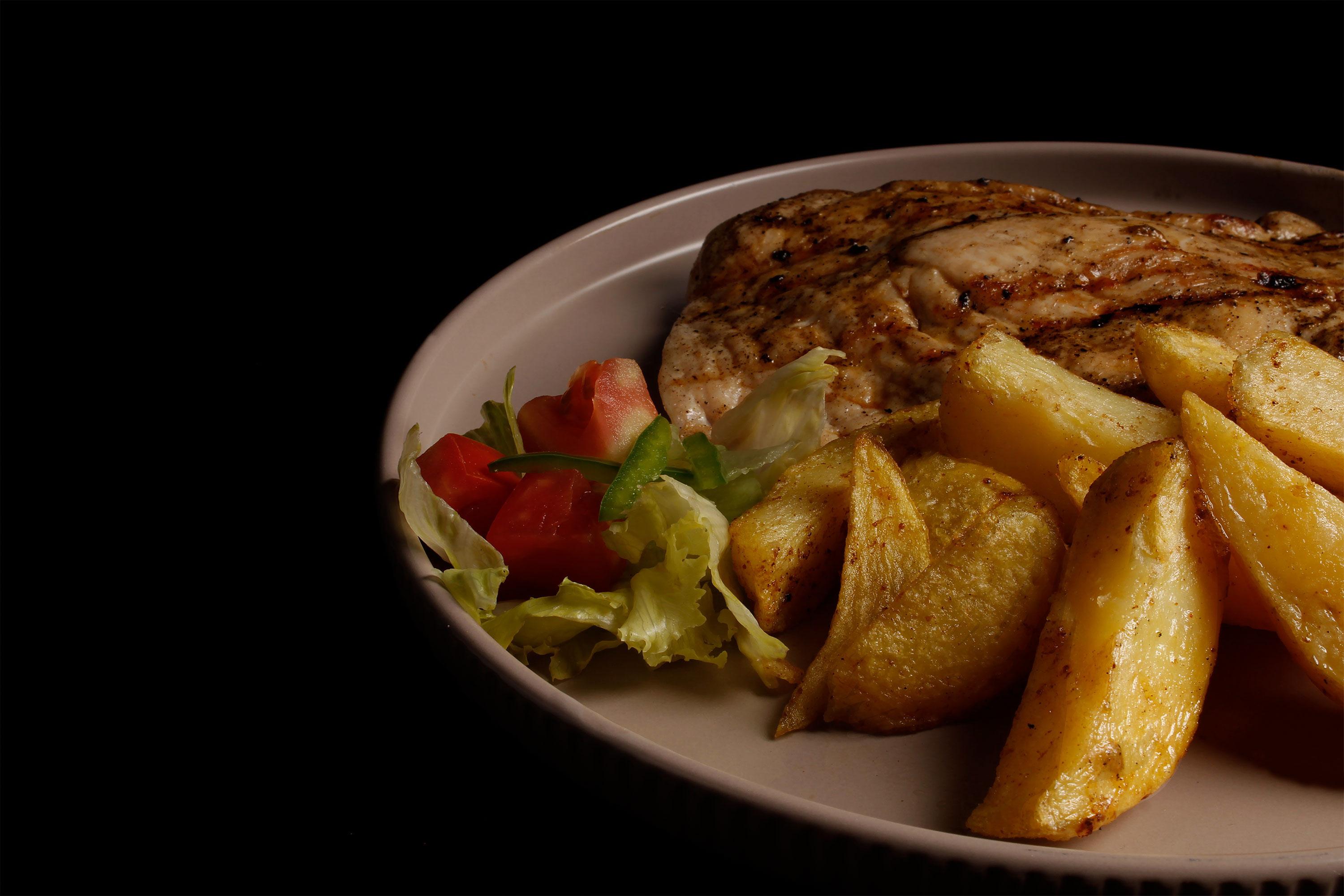 En la revista, se presenta una fotografía de un plato de comida con pollo y papas. La imagen muestra el pollo bien dorado y las papas asadas a su lado, resaltando los colores cálidos y la textura crujiente de ambos. El fondo es sencillo, permitiendo que el plato sea el centro de atención.