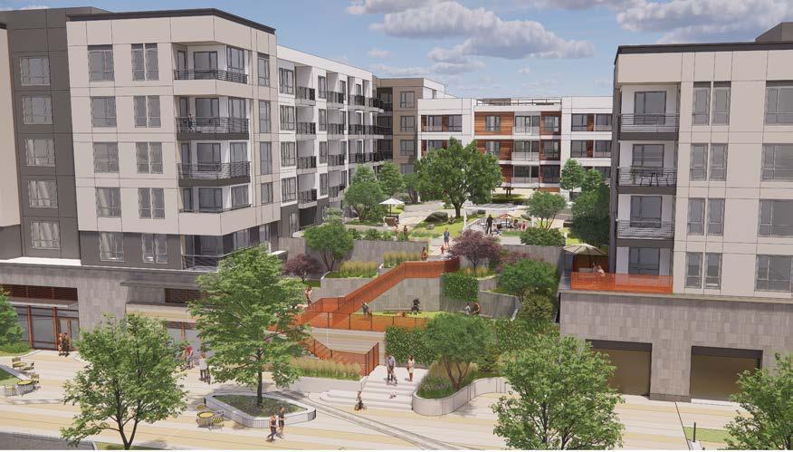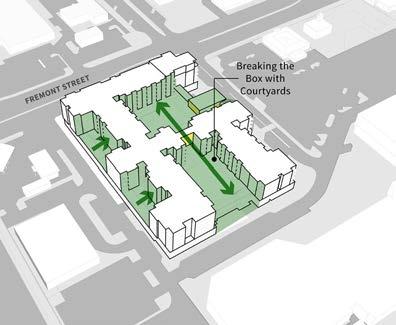 COURTYARDS OPEN TO STREET TO BREAK UP MASS CENTRAL COURT CASCADES DOWN TO RETAIL STREET BLDG ALONG CAPITOL EXTENSION STEPS DOWN ONE STORY TRANSPARENT PODIUM AMENITIES ENLIVEN CAPITOL FRONTAGE CONTINUOUS CONNECTED COURTYARDS
