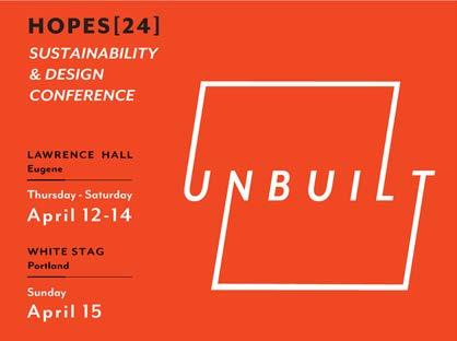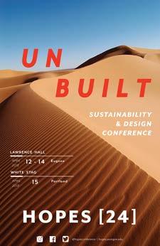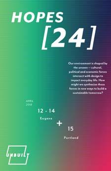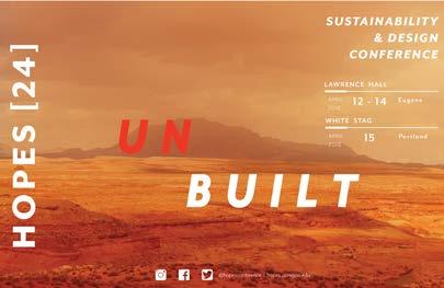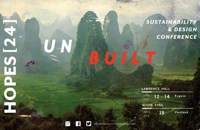 HOPES [24] SUSTAINABILITY & DESIGN CONFERENCE UNKNOWN UNHEARD UNSEEN hopes.uoregon.edu @hopesconference April 12-14 Eugene Thurs Sat LAWRENCE HALL April 15 Portland Sunday WHITE STAG PAUL STEINBERG HOPES [24] @hopesconference hopes.uoregon.edu Paul Steinberg is a professor of political science and environmental policy and Malcolm Lewis Chair of sustainability & society at Harvey Mudd College. His work focuses on global environmental politics, with a special interest in biodiversity conservation and environmental policy in developing countries. His latest book Who Rules the Earth? is part of the Social Rules Project, nonprofit public outreach initiative that raises awareness for institutional causes of environmental problems. SATURDAY APR 14 5:00 — 6:00 PM PRESENTATION 7:00 — 8:00 PM PANEL LAWRENCE HALL RM 115 FREE hopes.uoregon.edu @hopesconference Uncharted: Designing in the Current Political Climate The current political climate and its social and economic implications have left people feeling skeptical, angry, and tense. As designers, is our job to create and build with people in mind. Though current policies and laws may not affect us directly (yet), it is our responsibility to use our privilege to better serve and advocate for those most affected, especially those who are unheard. We ask you to join us alongside professors and practicing professionals in the design field to examine the difficult question: What can we do within our scope of work to advocate for those who are neglected everyday? Chris Cornelius Michele Eggers Gabriel Montemayor PANEL BY: STANDD + HOPES[24] TH URS APR 12 7:00 — 8:00 PM P ANE L LAWREN C E H ALL RM 20 6 Chris an enrolled member the Oneida Nation and professor the School of Architecture & Urban Planning the University Wisconsin. His research and practice focus the architectural translation culture and history. In 2003, he founded studio:indigenous, design consulting practice serving American Indian clients. Michele an assistant professor at Pacific University and serves on the board Beyond Toxics. She interested addressing interrelated issues of environmental and economic exploitation, poverty, repression, and violence. She has visually documented environmental rights abuses Central America and coordinated human rights speaking engagements. Gabriel an Assistant Professor Landscape Architecture at the University Texas at Austin. founding partner of LABOR Studio based Chihuahua, Mexico, his projects and research explore public space as social and environmental integrator along the US-Mexico border region. APRIL 10:1511:30 Rethinking Resilient Systems 13 panel with Tim Smith, Emma Prichard, Mark Lakeman, Susan Jones and Ronald Rael. HOPES + DESIGN WEEK PDX THE WHITE STAG 11:451pm RM 144 Shirley Pape Forum RM 350 Floor 3R 1:153:30 Destructive Idealism: Empowering Local Community RM 451 Floor 4R 11 7pm8:30 Patterns Exhibition: Grand Opening and Reception This panel aims to challenge participants to rethink resilience in both their disciplines and lifestyles bringing different perspectives that may seem incompatible into coherence. Rethinking Resilient Systems lecture with Ronald Rael. This panel aims to challenge participants to rethink resilience in both their disciplines and lifestyles bringing different perspectives that may seem incompatible into coherence. workshop with Tim Smith from SERA. This workshop will challenge participants to rethink resilience, empowering action in their neighborhoods. Light Court Commons Floor 1 exhibition in collaboration with HOPES and What is Technology? Exhibition features art-science works across astronomy, biology, chemistry, materials science, physics, and nanotechnology, prints, multisensory installation art, as well as the juxtaposition of material and representational works. MARKING THE INTANGIBLE, EXPRESSIONS OF UNSEEN FORCES IN THE LANDSCAPE with ASLA & CHRIS CORNELIUS Chris Cornelius will lead a group of 10 students to challenge and redefine their perception of the built environment. Through hand media techniques taught by Chris, this workshop will develop “maps” that aim to express familiar spot on campus in an unfamiliar way. FRI APR 13 10:00 — 11:30 AM WORKSHOP LAWREN C H ALL RM 279 RSVP at: hopes.uoregon.edu/workshops hopes.uoregon.edu @hopesconference