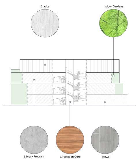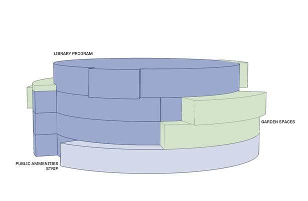 Housing Units: 48 - Co-Living units (200sqf) 7 - 2 Bedroom units (400sqf) Housing Amenities: Shared kitchen Lounge Game Room BBQ Roof Patio Roof garden Gym Secure Bike storage Laundry Facilities Commercial Units: 10 Incubator Retail Units (300 sqf) 3 Commercial Units (400 sqf) 8 Rentable Art studios 1 Art gallery Parking: 30 Cars 40 Bikes 33,293 Total SQFT Library: Stacks - 17,000 sqf Indoor Gardens - 4,570 sqf Outdoor Terraces - 1,596 sqf Childrens - 4,985 sqf Teens - 4,625 sqf Staff Only - 6,825 sqf Working Spaces - 10,465 sqf Public Lobby - 9,135 sqf Commercial Units: Ceramics studio Art classroom Woodshop Cafe Community space Rentable retail space Parking: 70 cars 69,841 Total SQFT BUILDING DATA 14 23 26 FORM FINDING 26 Housing Units: 48 - Co-Living units (200sqf) 7 - 2 Bedroom units (400sqf) Housing Amenities: Shared kitchen Lounge Game Room BBQ Roof Patio garden Gym Secure Bike storage Laundry Facilities Commercial Units: 10 Incubator Retail Units (300 sqf) 3 Commercial Units (400 sqf) 8 Rentable Art studios 1 Art gallery Parking: 30 Cars 40 Bikes 33,293 Total SQFT Library: Stacks - 17,000 sqf Indoor Gardens - 4,570 sqf Outdoor Terraces - 1,596 sqf Childrens - 4,985 sqf Teens - 4,625 sqf Staff Only - 6,825 sqf Working Spaces - 10,465 sqf Public Lobby - 9,135 sqf Commercial Units: Ceramics studio Art classroom Woodshop Cafe Community space Rentable retail space Parking: 70 cars 69,841 Total SQFT BUILDING DATA 14 Rainwater Management: bioswale + permiable pavements + rainwater storage Contaminated Water Management: gray water harvesting + black water composting Ventilation: passive cooling + chimney effect Solar Managment: shading louvers + passive heating Energy Production: PV pannels + pavegen pressure pads Food Production: garden plots + green roof SUSTAINABILITY 92
