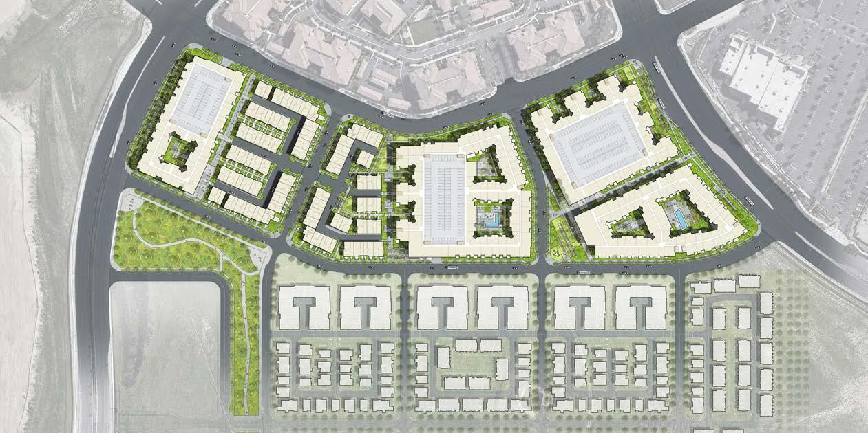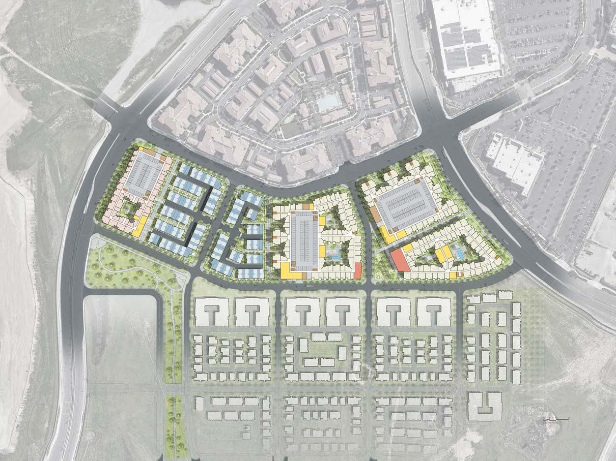 Tustin Legacy is a 1,270 unit development with a mix of affordable housing, for-sale townhouses, market rate apartments and retail spaces. The ethos of the design refelcts Tustin’s resiliency the adaptation of modern design while maintaining the neighborhood look and feel of a small-town community, bridging the two influences. As a large scale development that spans across Compass Ave, it was important to break down the scale by providing paseos and open spaces.