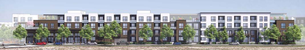 The massing of the building strives to create a variety of building heights and articulated building corners. Stepped or stacked volumes are expressed to correspond with open space design. The design incorporates modern and noble materials throughout, regardless of the target demographic of the housing type. Pedestrian experience is further activated by open spaces at the perimeter of the development that includes a system of stoops, establishing human-scaled transition between private and public open spaces. Passive outdoor spaces will encourage a variety of activities related to neighborhood life, while the view of the historic hangars in the distance grounds the project in the current urban condition, quietly celebrating the rich history of the site.