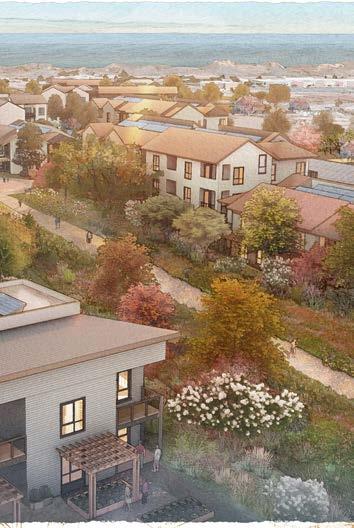 The ethos of our design reflects Tustin’s resiliency, the adaptation of modern design while maintaining the neighborhood look and feel of a small-town community, bridging the two influences. The design incorporates mixed-income as well as mixed-density housing to create various building massing and exterior architectural. The development is anchored by a 4-story market-rate building at Tustin Ranch Road, and a 5-story affordable housing community at Warner Avenue. Lower-scale townhomes are placed in the center of the site, creating visual interest along Legacy Road and Compass Avenue. Paseos and opens spaces are weaved into the design to breakdown the larger blocks reminiscent of MCAS, while creating diverse open spaces such as pocket parks and town plazas, for both community gathering and individual retreat, harkening back to agrarian heritage.