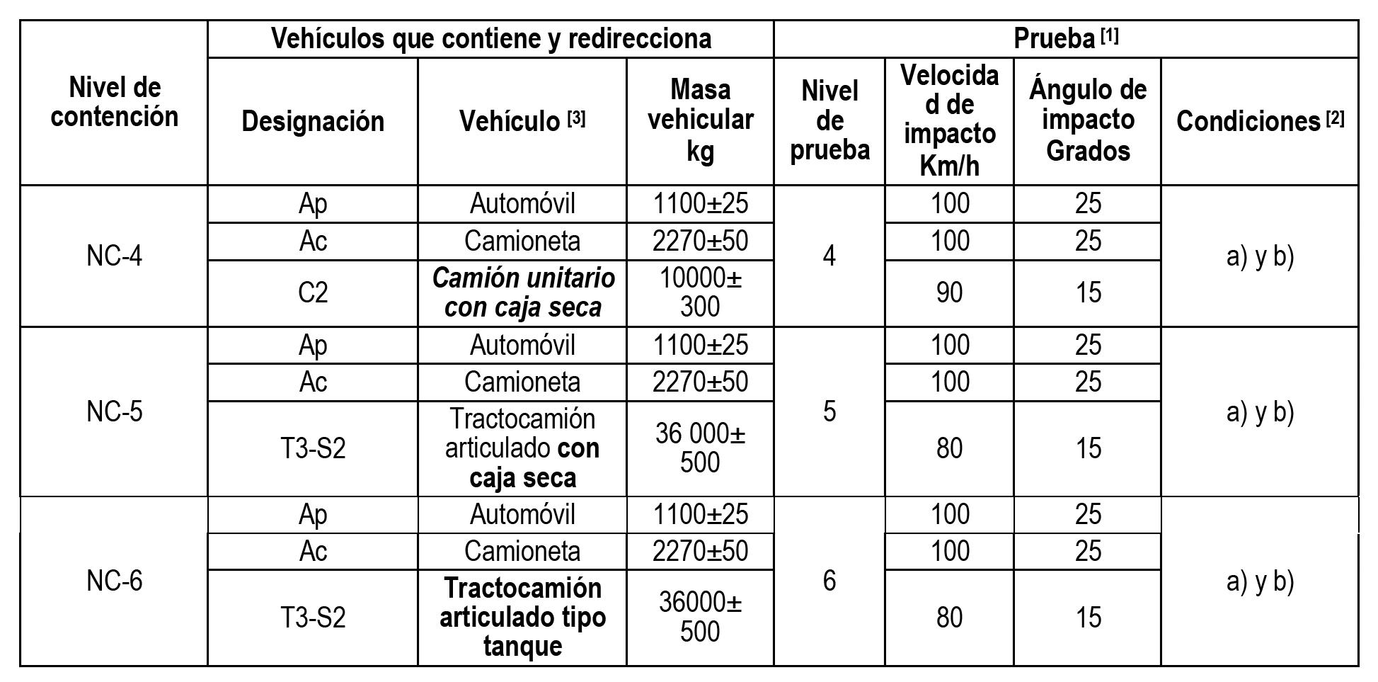 [2] Las condiciones que han de satisfacerse para cada nivel de prueba son: a) La barrera o parapeto, dentro de su deflexión dinámica, debe contener y redireccionar al vehículo sin que éste la penetre ni la cruce por arriba o por abajo; los elementos, fragmentos u otros residuos de la barrera o del vehículo no deben penetrar a su cabina o generar algún tipo de peligro a otros vehículos y peatones; la cabina del vehículo no debe presentar deformaciones que representen riesgos para sus ocupantes; el tanque de combustible debe permanecer intacto y sin punzonamientos.
