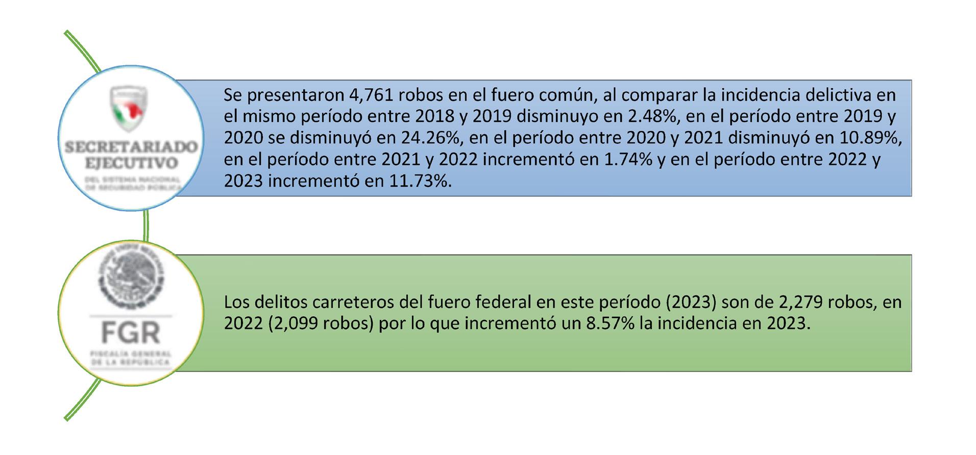 Los delitos carreteros del fuero federal en este período (2023) son de 4,294 robos, en 2022 (4,047 robos) por lo que incrementó un 6.10% la incidencia en 2023.
