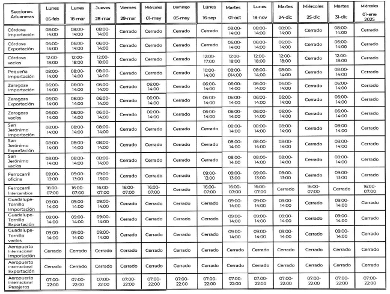 Se publicó en el Diario Oficial de la Federación (DOF), el Anexo 4 de las Reglas Generales de Comercio Exterior para 2024, en el cual se establecen los horarios de operación de las Aduanas del país, entre los que se encuentran los siguientes: