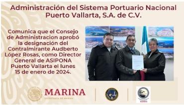 La Administración del Sistema Portuario Nacional (ASIPONA) Puerto Vallarta, informa que, por acuerdo del Consejo de Administración a partir del 15 de enero del presente, toma cargo como Director General el Contralmirante Audberto López Rosas.