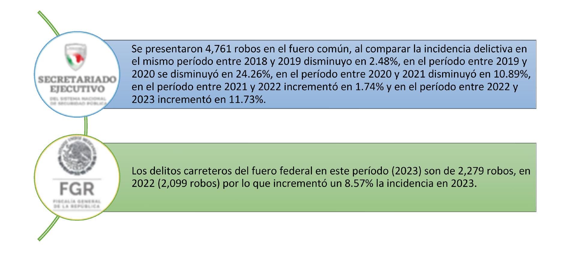 Los delitos carreteros del fuero federal en este período (2023) son de 4,667 robos, en 2022 (4,429 robos) por lo que incrementó un 5.37% la incidencia en 2023.