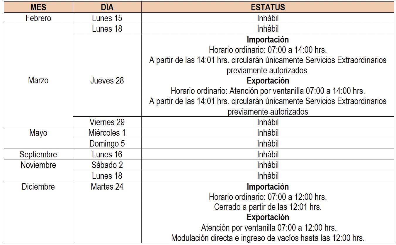 La Administración de la Aduana de Altamira, nos ha informado mediante comunicado No.316 los días inhábiles y/o festivos para el año 2024 y su horario de servicio, siendo estos los siguientes: