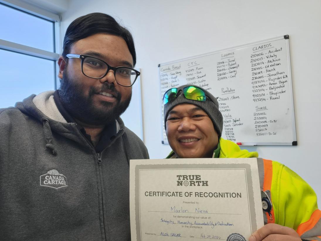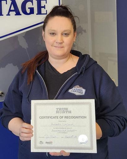 Lorsque vous voyez un membre de l'équipe qui fait du bon travail, faites-lui savoir en lui en voyant une carte de remerciement ou un certificat. Chaque trimestre, une équipe de chaque région examine toutes les soumissions et reconnaît les personnes qui ont dépassé les attentes pour recevoir un chèquecadeau de 50$.Chaque lauréat est également admissible au Prix du président en janvier. Vous pouvez envoyer par courriel votre reconnaissance, ainsi que la raison pour laquelle vousavez désigné le récipiendaire et les valeurs qu'il adémontrées, à recognition@canadacartage.com, ou en ligne à www.canadacartage.com/truenorth