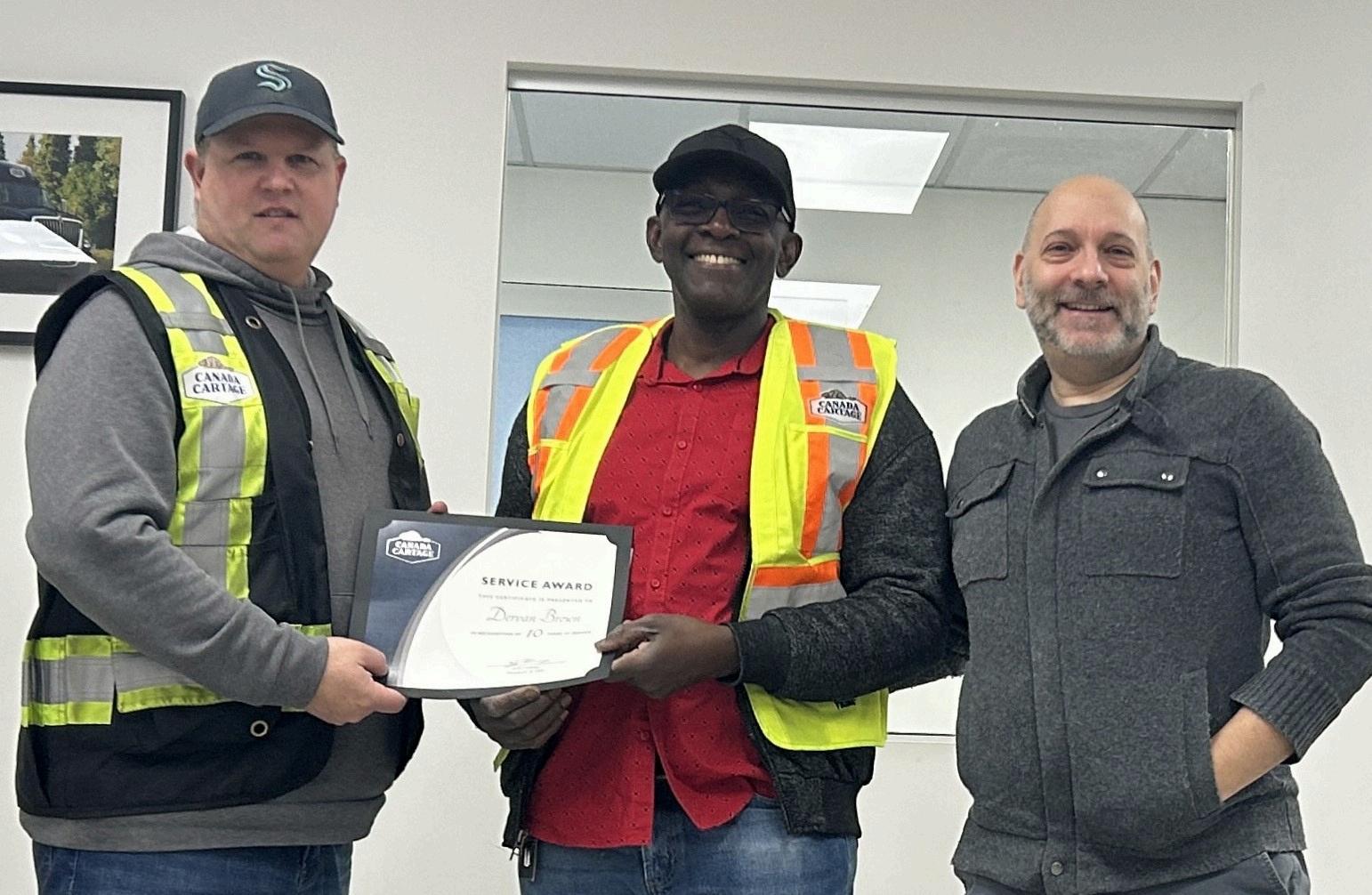 Scott Henson, responsable des opérations, à gauche, et Joe Millossi, responsable principal des opérations, à droite, a remis au camionneur d’entreprise Dervan Brown un certificat soulignant ses 10 années de service Scott, Joe, et Dervan travaillent à notre terminal de Port Coquitlam, en Colombie-Britannique