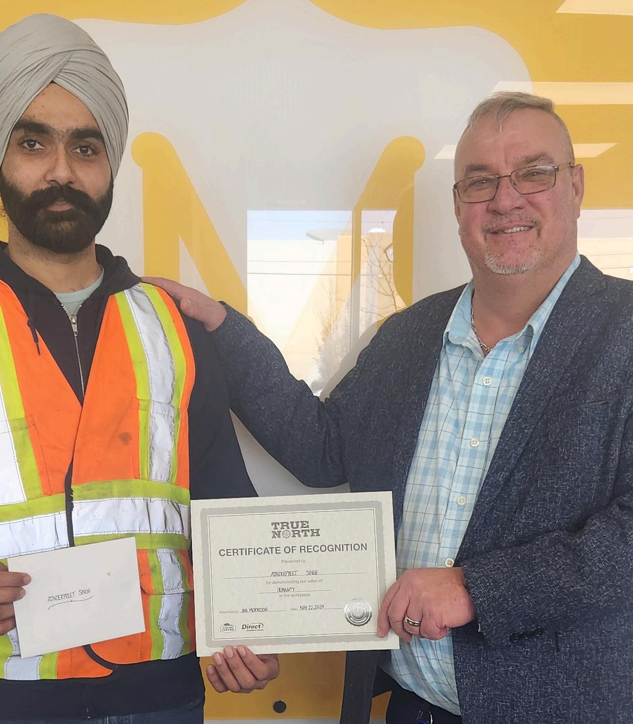 Le directeur des opérations, Rick McIntosh, à droite, a présenté au camionneur d’entreprise Atinderpreet Singh un certificat Étoile du Nord pour avoir démontré les valeurs de notre entreprise. Rick et Atinderpreet travaillent à notre terminal d’Edmonton, en Alberta.
