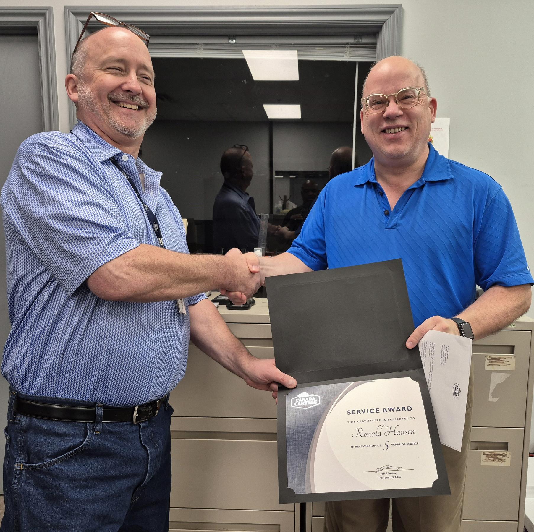 Le directeur de la sécurité, Gord Karpf, à gauche, a décerné au responsable de la sécurité et de la conformité, Ronald Hansen, un certificat soulignant ses 5 années de service. Gord et Ronald travaillent à notre siège social de Mississauga en Ontario.