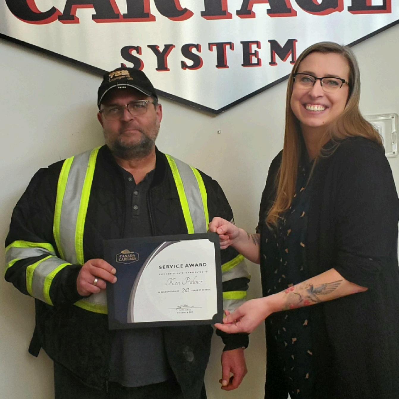 La superviseure des opérations Murrie Rhodes, à gauche, a remis un prix pour ses 20 années de service au camionneur d’entreprise Ken Palmer, à droite. Murrie et Ken travaillent à notre terminal d’Edmonton, en Alberta.