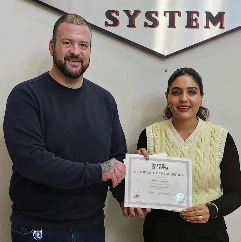 Le responsable principal des opérations Jason Norrish, à gauche, a remis au superviseur des opérations Jyoti Khosla un certificat Étoile du Nord pour avoir démontré nos valeurs d’entreprise. Jason et Jyoti travaillent à notre terminal d’Edmonton, en Alberta.