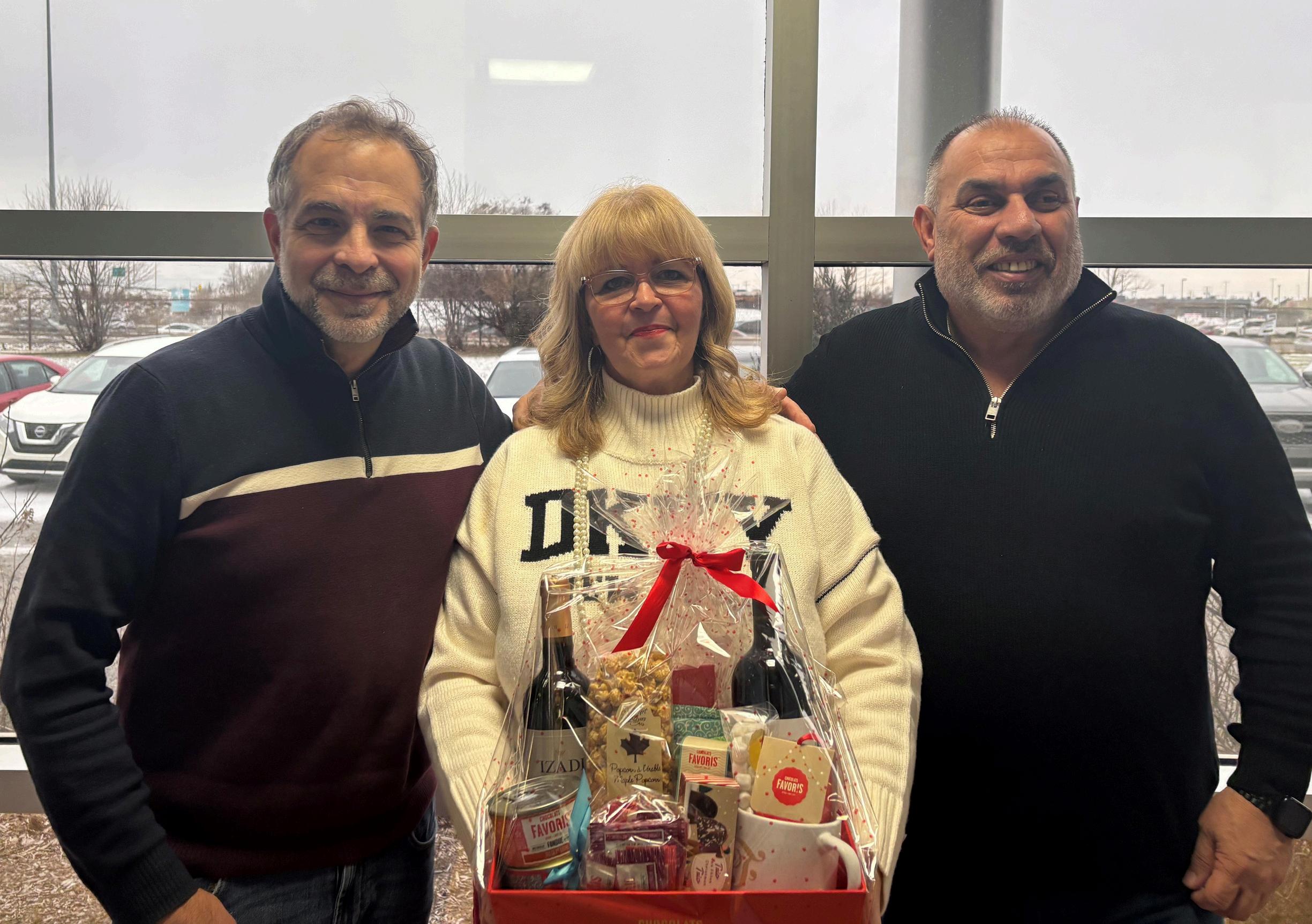Joanne Laurendeau, cliente de longue date d’ABF, a reçu un cadeau de retraite de la part du vice-président des opérations Domenic Santini, à gauche, et du directeur des opérations Joe Barao, à droite Domenic et Joe travaillent à notre terminal de Laval, au Québec