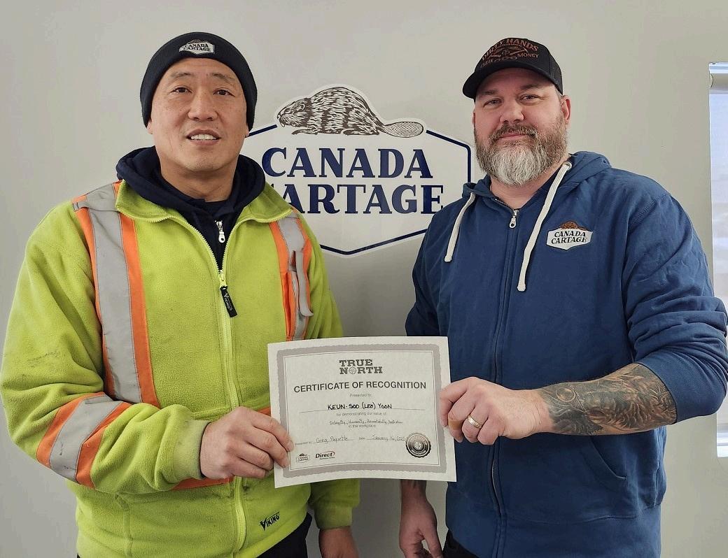 Le responsable des opérations Greg Paquette, à droite, a remis à Keun-Soo Yoon un certificat Étoile du Nord pour avoir démontré les valeurs de notre entreprise Greg et Keun-Soo travaillent à notre terminal d’Ottawa, en Ontario