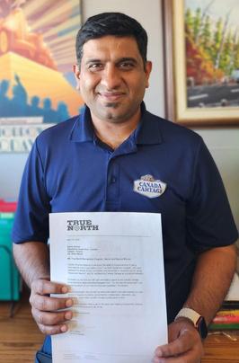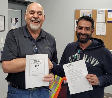 Le directeur des opérations, Rick McIntosh, à gauche, a présenté au coordonnateur des comptes Mahekdeep Judge, à droite, un certificat Étoile du Nord pour avoir démontré les valeurs de notre entreprise Rick et Mahekdeep travaillent tous deux à notre terminal d’Edmonton.