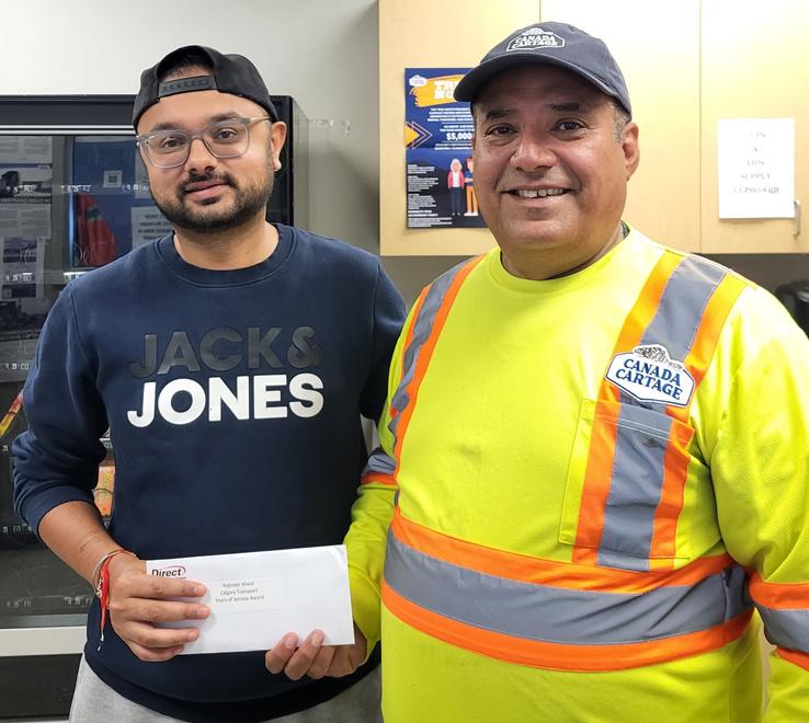 Calgary Dispatcher Sim Mangat, right, presented Company Driver Bertram Jones with his 10-year service anniversary certificate.