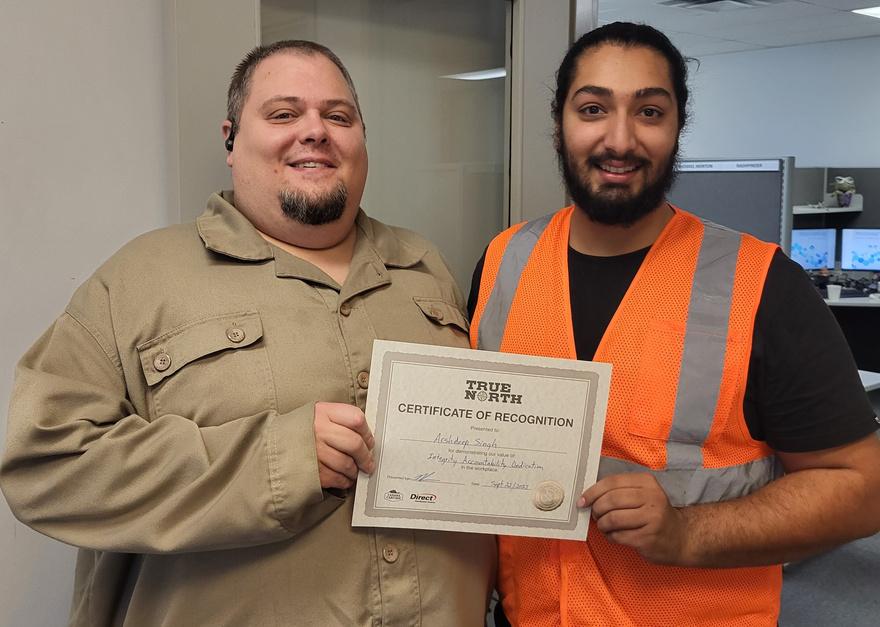 Operations Supervisor Michael Morton, left, presented Calgary Company Driver Arshdeep Singh with a True North Certificate for demonstrating our company’s values.