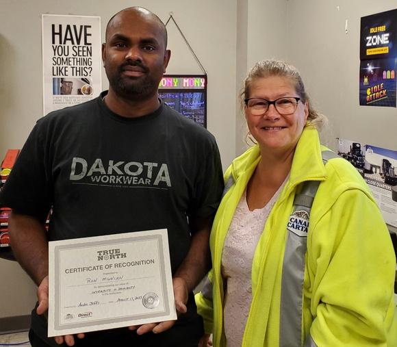 Frontline Operations Manager Audra Jeffs, right, presented Calgary Company Driver Ron Munian, left, with a True North Certificate for demonstrating our company’s values..