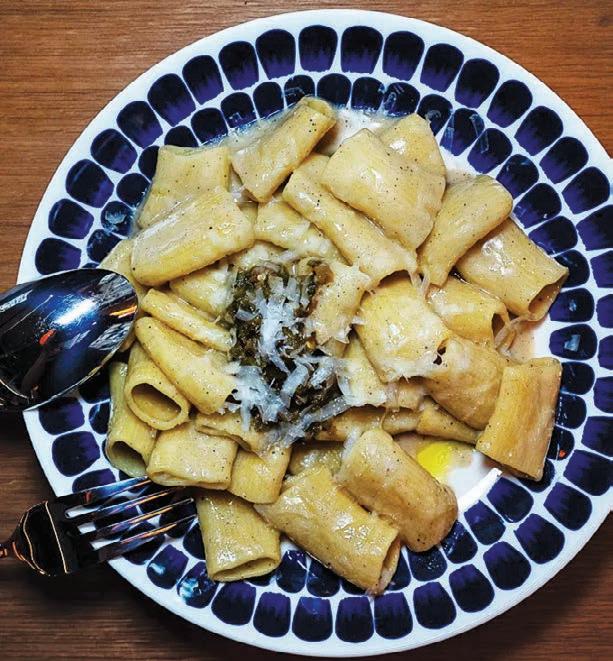 Clockwise from top left: Elio Volpe’s bright and airy dining room; ultra-thin crust Romanstyle pizza; rigatoni cacio e pepe with 10-year cheddar and roasted jalapeno.