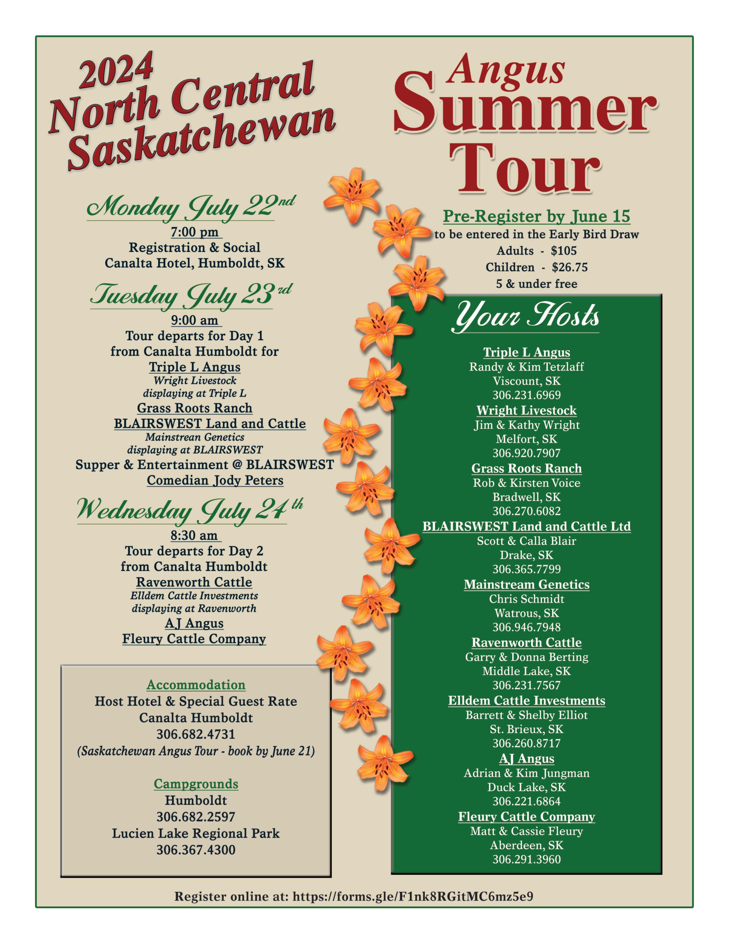 July 23rd and 24th will be the 2024 dates for our ever-popular Saskatchewan Angus Summer Tour We look forward to joining you and many others in the North-central area of the province for what promises to be another excellent and must attend event. Help out our hosts by pre-registering either online or with the form that is printed in this issue