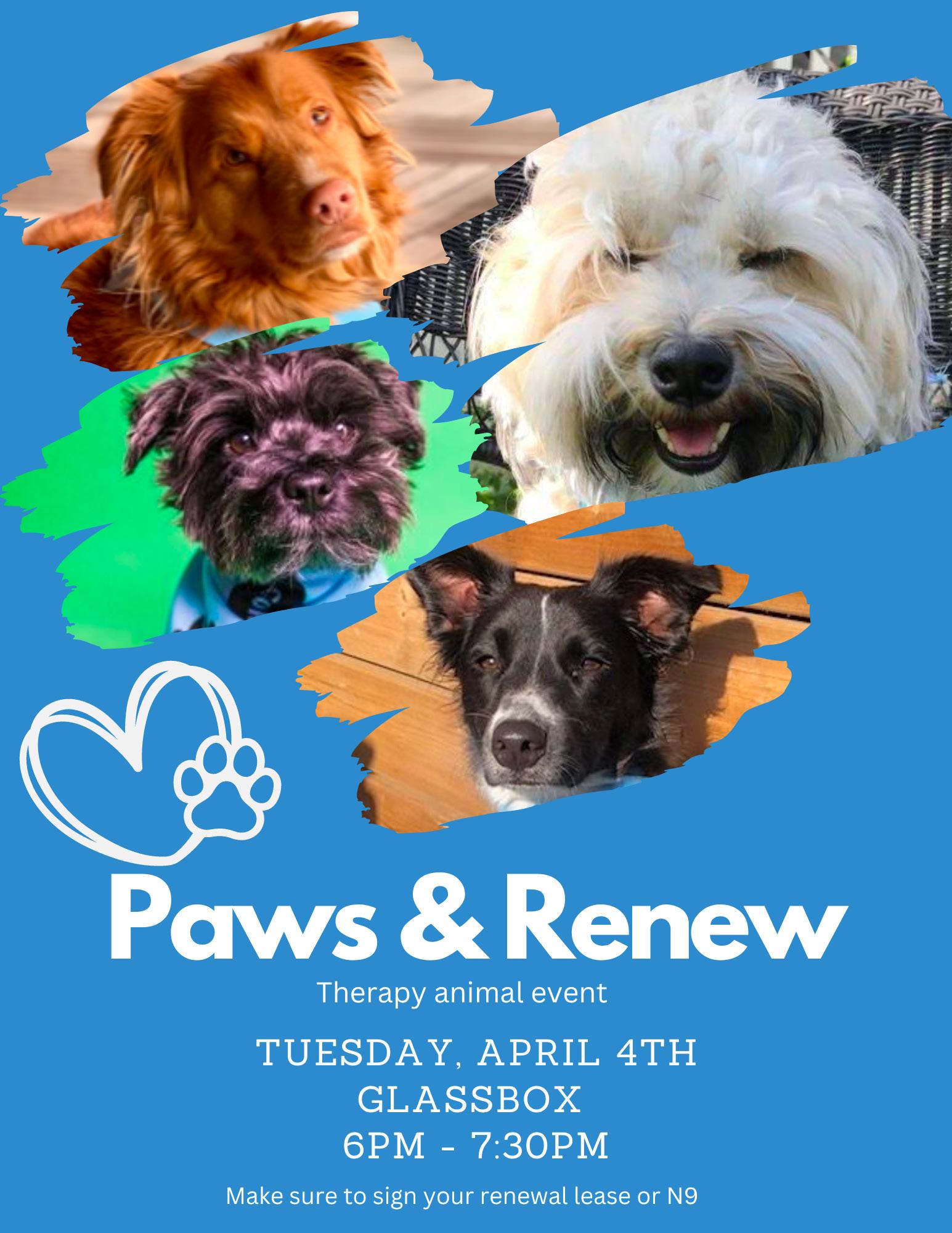 In addition, we want to highlight some exciting events happening at Parkside this April. Stop by in the Glassbox on April 4th between 6-7:30pm for Paws & Renew and meet with therapy animals. Find stationary supplies for the Exam jam in all the study spaces on the second floor and in all the study lounges throughout the month of April. You can also adopt a plant on April 13th as we celebrate International Plant Appreciation Day!