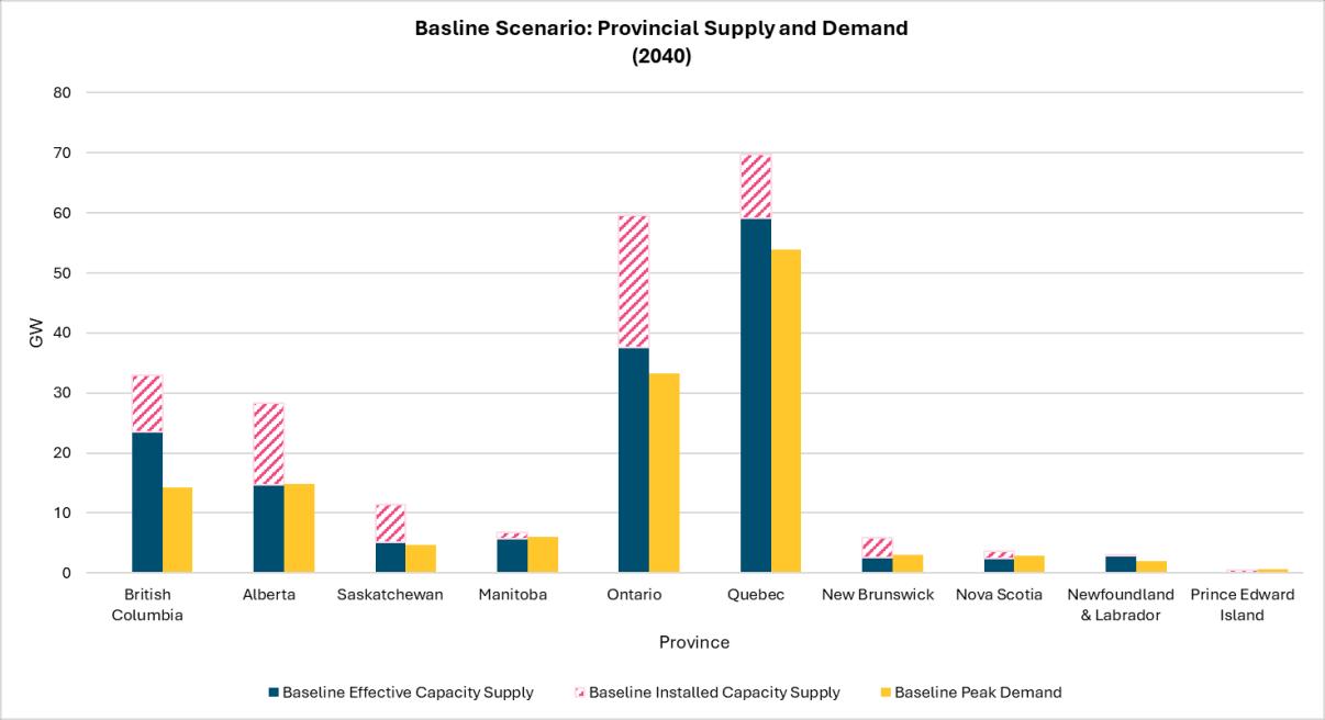 This analysis compares each province’s projected 2040 effective capacity and peak demand (withinprovince demand), expressed as a normalized ratio, where (+/-) values indicate potential surplus or deficit. To assess system adequacy under varying conditions, two scenarios are modeled: (1) the Baseline scenario, which uses provincial forecasts for demand growth and planned capacity additions; and (2) the Stretched scenario, which applies an illustrative incremental15% increase to each province’s annual total demand forecast and a 25% reduction to annual incremental growth in generation capacity to reflect potential stressors such as extreme weather events, policy shifts that increase demand and permitting or supply chain constraints which slow build limits and growth in capacity infrastructure readiness. Demand data came from Electricity Canada member-validated data [1], with gaps filled using linear forecasting. Capacity data was sourced from the CER [2] or directly from members [1], considering only domestic generation except for Quebec’s Churchill Falls agreement [5] For both the Baseline and Stretched scenarios, capacity was adjusted to account for the effective load carrying capability (ELCC) of different generation resources (i.e., the ability for a generation source to reliably meet peak demand). It is assumed intermittent resources (wind and solar) have an ELCC of 0 and all other supply resources have an ELCC of 1. The resulting ratios provide a comparison across provinces, highlighting where risks may emerge and where surplus capacity could enable interprovincial support.