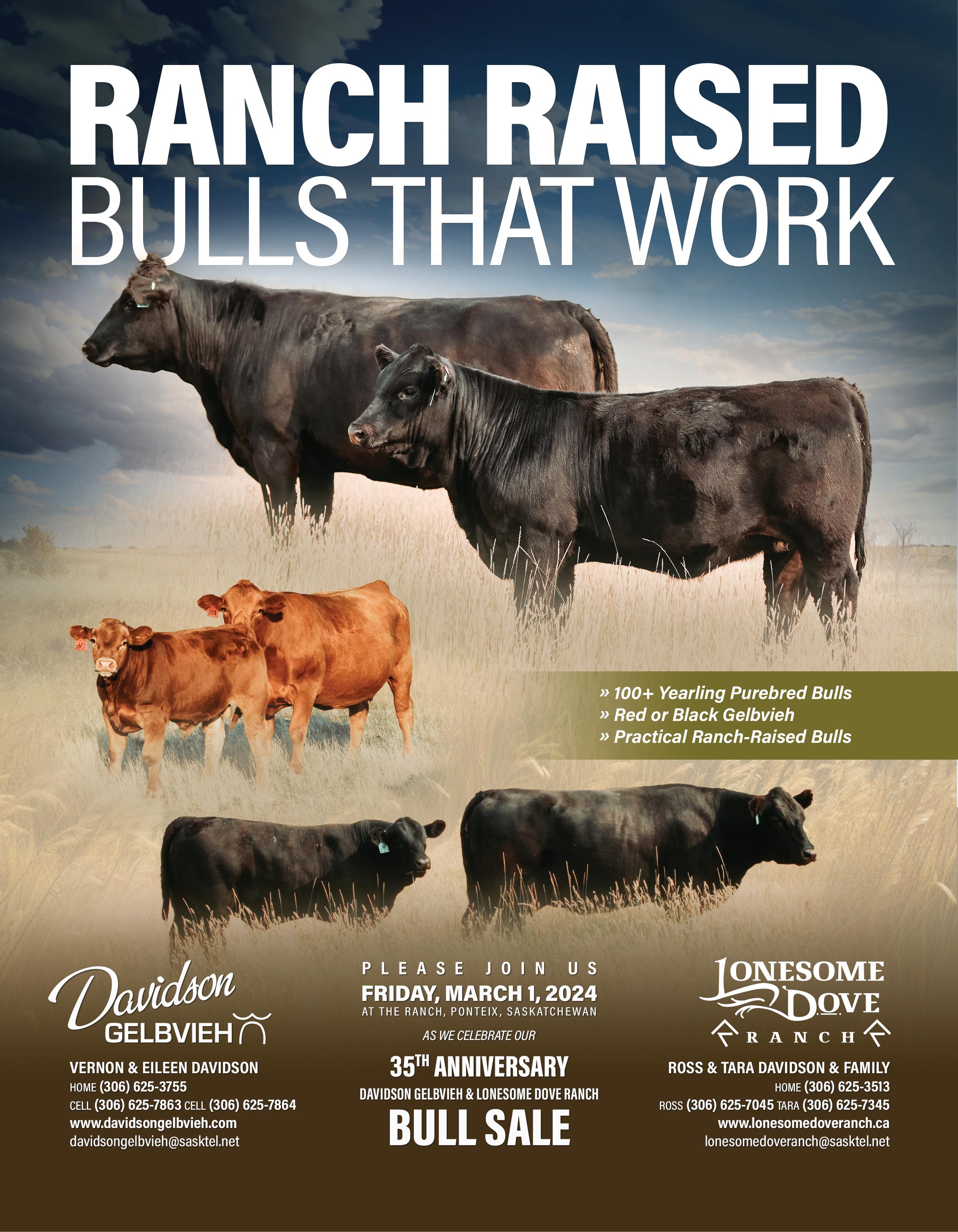 March 1 - 35th Anniversary Davidson Gelbvieh & Lonesome Dove Ranch Bull Sale, At the ranch, Ponteix SK