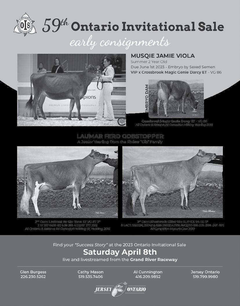 Rachel Quesnel, Jesey Canada It includes any movement onto or off your farm. Traceability is more than just tag activation. Support for provinces outside of Quebec Phone: 1-866-558-7223 info@dairytrace.ca Support in Quebec Phone: 1-866-270-4319 sac@attestra.com DairyTrace.ca DairyTrace_Print Ad_JerseyCanada_7.25x2.2_V1.0.indd 2 2022-10-20 11:12 AM CALEDON JERSEYS EST 1986 Bruce, Sonya & David McKeown Tel/Fax: (705) 953-9935 s.mckeown57@gmail.com 1029 Peniel Road Woodville, ON K0M 2T0 Berwick ON Est. 1994 THERIHOFJerseys Theo & Ria Elshof (613) 330-1473 therihof@hotmail.com Kevin, Marleen, Stanley, Lydia & Ella (613) 978-1216 kevin_elshof@hotmail.com Current Classification: 8ME 6EX 35VG 32GP 7G