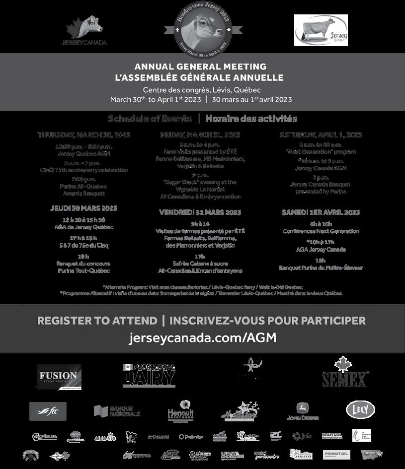 Nous sommes heureux de tenir notre assemblée générale annuelle à Lévis, Québec en conjonction avec l’AGA de Jersey Québec. Cette opportunité unique offrira aux participants 3 jours d’amitiés, de visites et de conférenciers – dans les deux langues officielles. C’est en revenant aux événements en présentiel que nous avons réalisé ce qui nous a manqué pendant ces dernières années de pandémie. Plusieurs membres planifient leur année autour de leur voyage à cette réunion, même avant de savoir où celle-ci se tiendra. La fin de semaine de l’AGA est une chance de visiter des troupeaux récompensés en compagnie d’autres adeptes de Jerseys et le nombre de personnes qui y assistent chaque année illustre que nos membres sont passionnés de leur travail, de la race et de l’association. Pour plus d’informations pour assister à notre AGA, consultez la page 55. Au plaisir de vous voir au Québec!